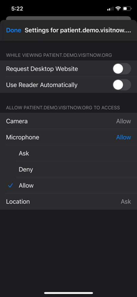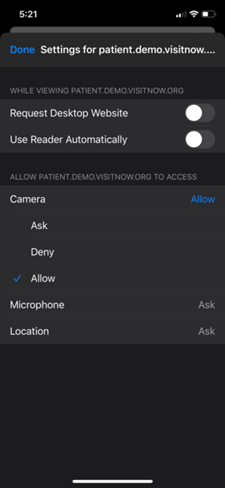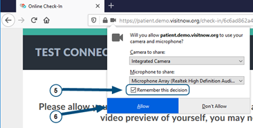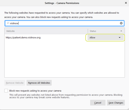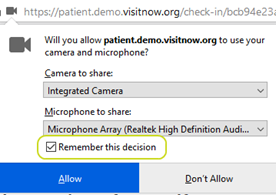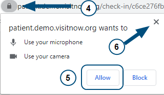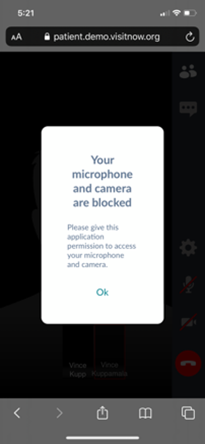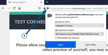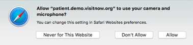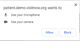 Check your browser settings to ensure that *.visitnow.org has been granted access to your camera and microphone.